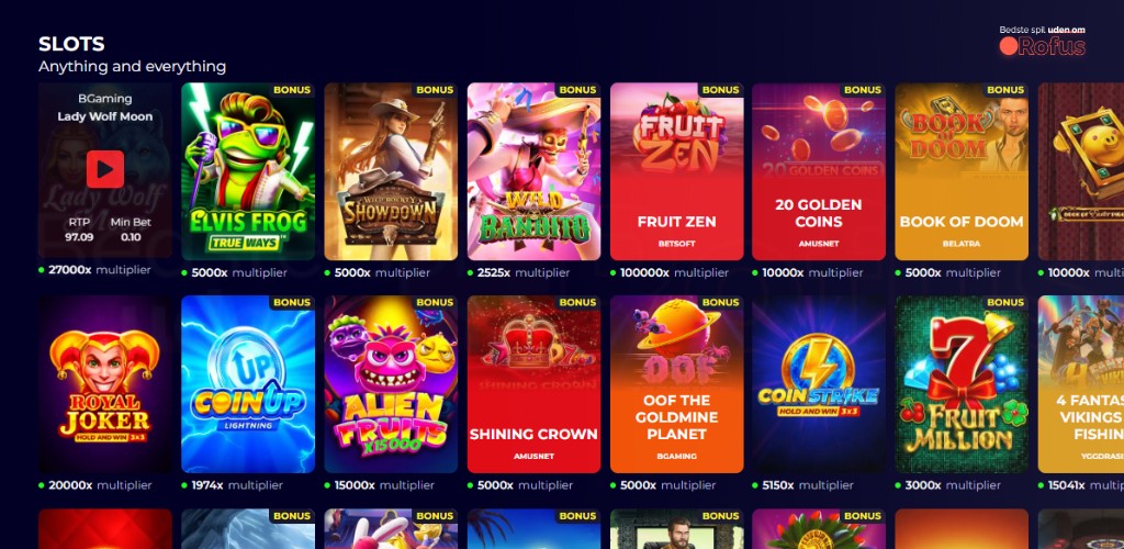 Hele indholdet kan gennemses efter spiltitel eller udbyder, mens de vigtigste casino kategorier inkluderer Drops & Wins (Slots), Penny Slots, New, Slots, Bonus Buys, Free Bonus, Poker og Mines. Spil kan også sorteres efter forskellige kriterier, hvilket gør det nemt for spillere at navigere på platformen uden problemer.